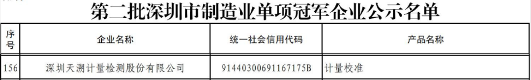 近日,深圳市工业和信息化局发布了《市工业和信息化局关于第二批深圳市制造业单项冠军企业公示的通知》。随着公示期结束,深圳天溯计量检测股份有限公司(以下简称“天溯计量”)正式获得“深圳市制造业单项冠军企业”荣誉称号。天溯计量成为市工信局累计公布的207家入选企业中,唯一入选的计量校准服务机构。这是继天溯计量获得“广东省制造业单项冠军企业”荣誉之后,取得的又一重大进展。此次成功入选,体现了深圳市工信局对天溯计量在服务型制造业计量检测领域综合技术服务能力的高度肯定。
