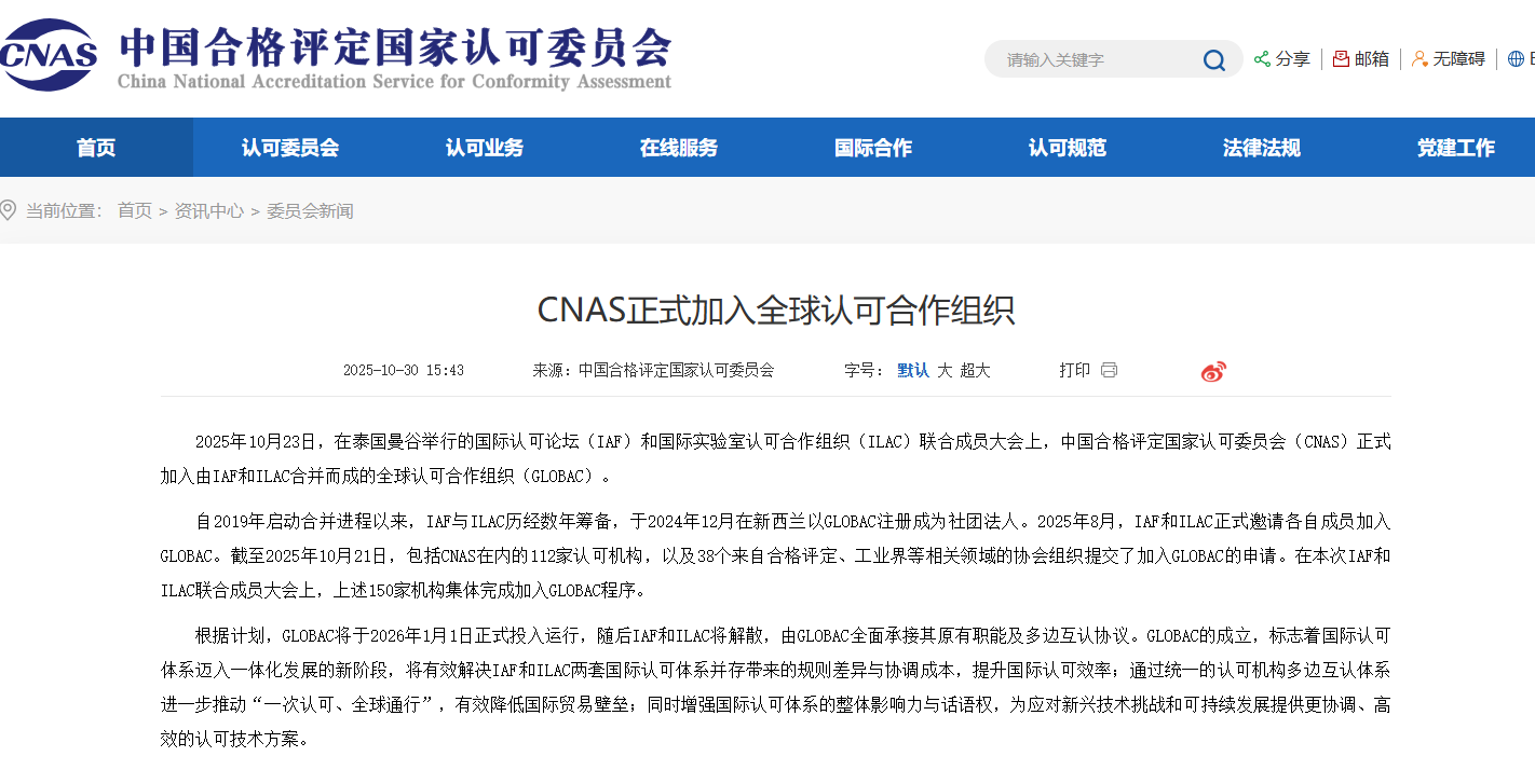 2025年10月23日,在泰国曼谷举行的国际认可论坛(IAF)和国际实验室认可合作组织(ILAC)联合成员大会上,中国合格评定国家认可委员会(CNAS)正式加入由IAF和ILAC合并而成的全球认可合作组织(GLOBAC)。