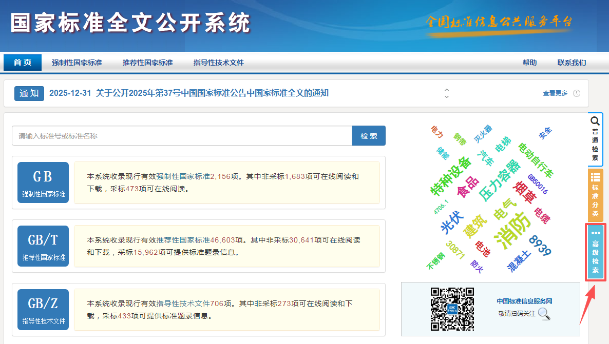 1.在页面导航条选择“强制性国家标准”或“推荐性国家标准”类别标签,查询相应类别的标准。