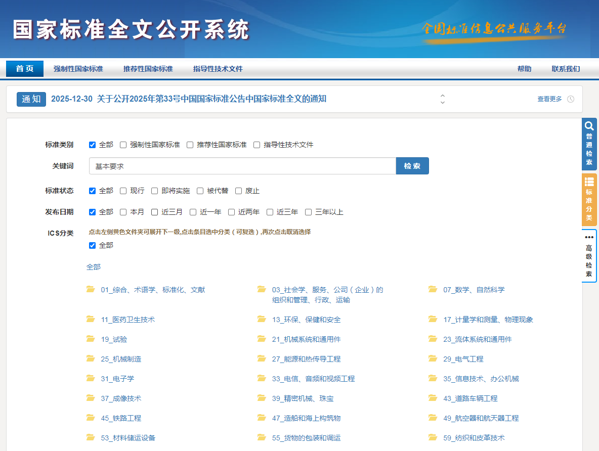 2.可根据标准状态、发布日期、ICS分类筛选想要查询或下载的标准。